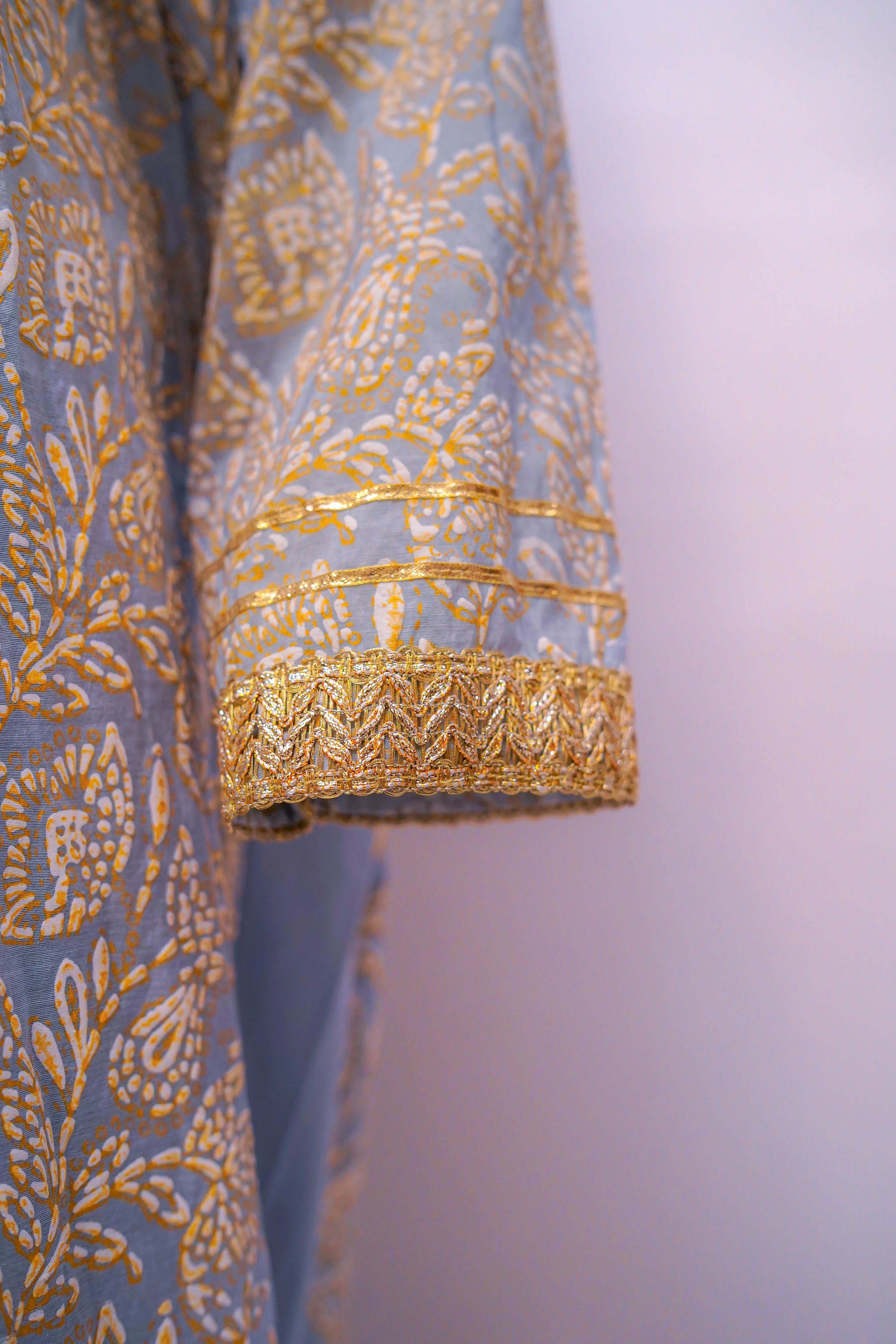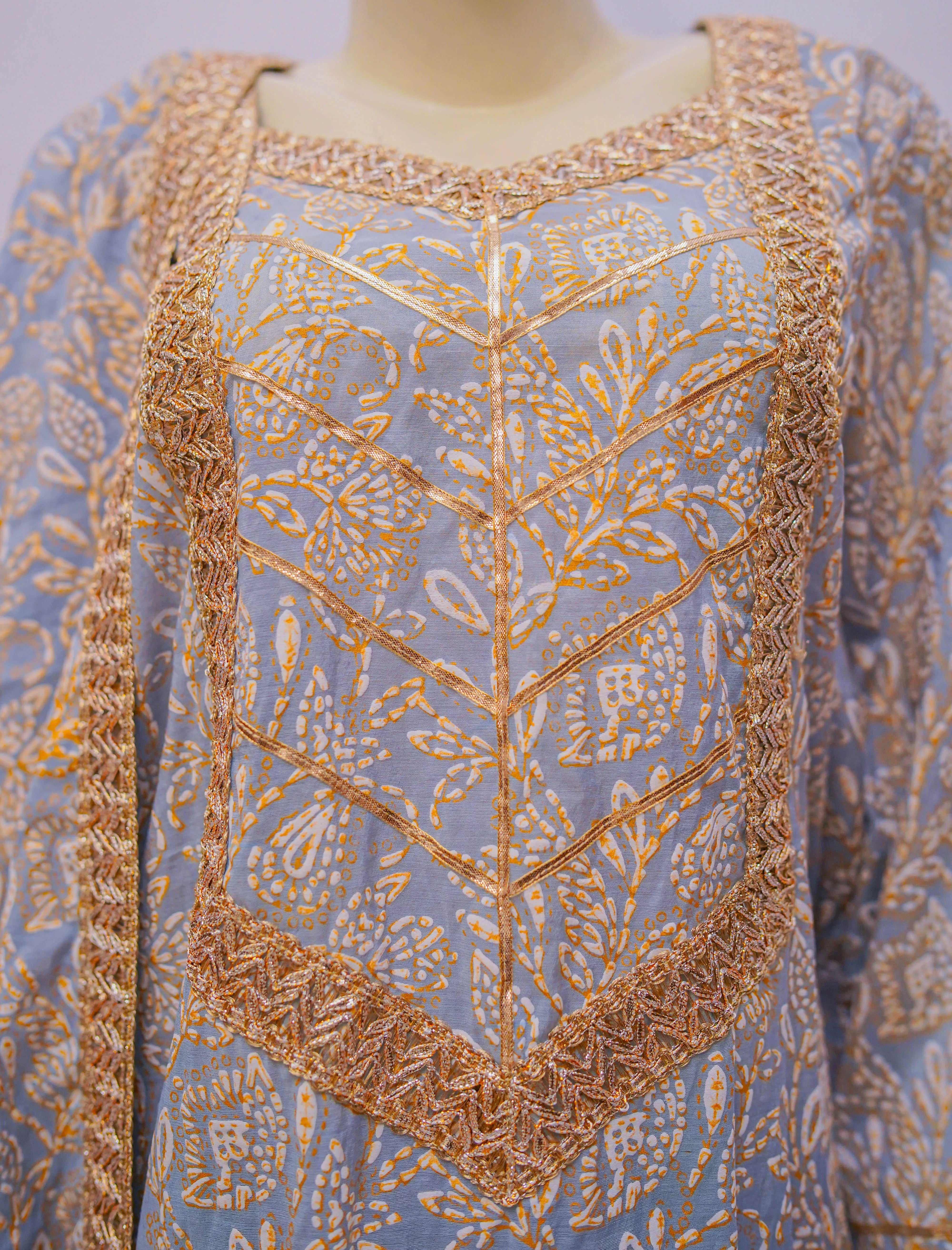 This blue grey silk lawn suit comes fully stitched and ready-to-wear. You don’t have to worry about fittings or tailoring.