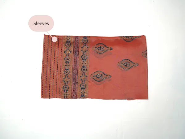 The highlight of this ensemble lies in its stunning gold and blue block printing. This is a detail that adds depth and artistry to the warm coral base.