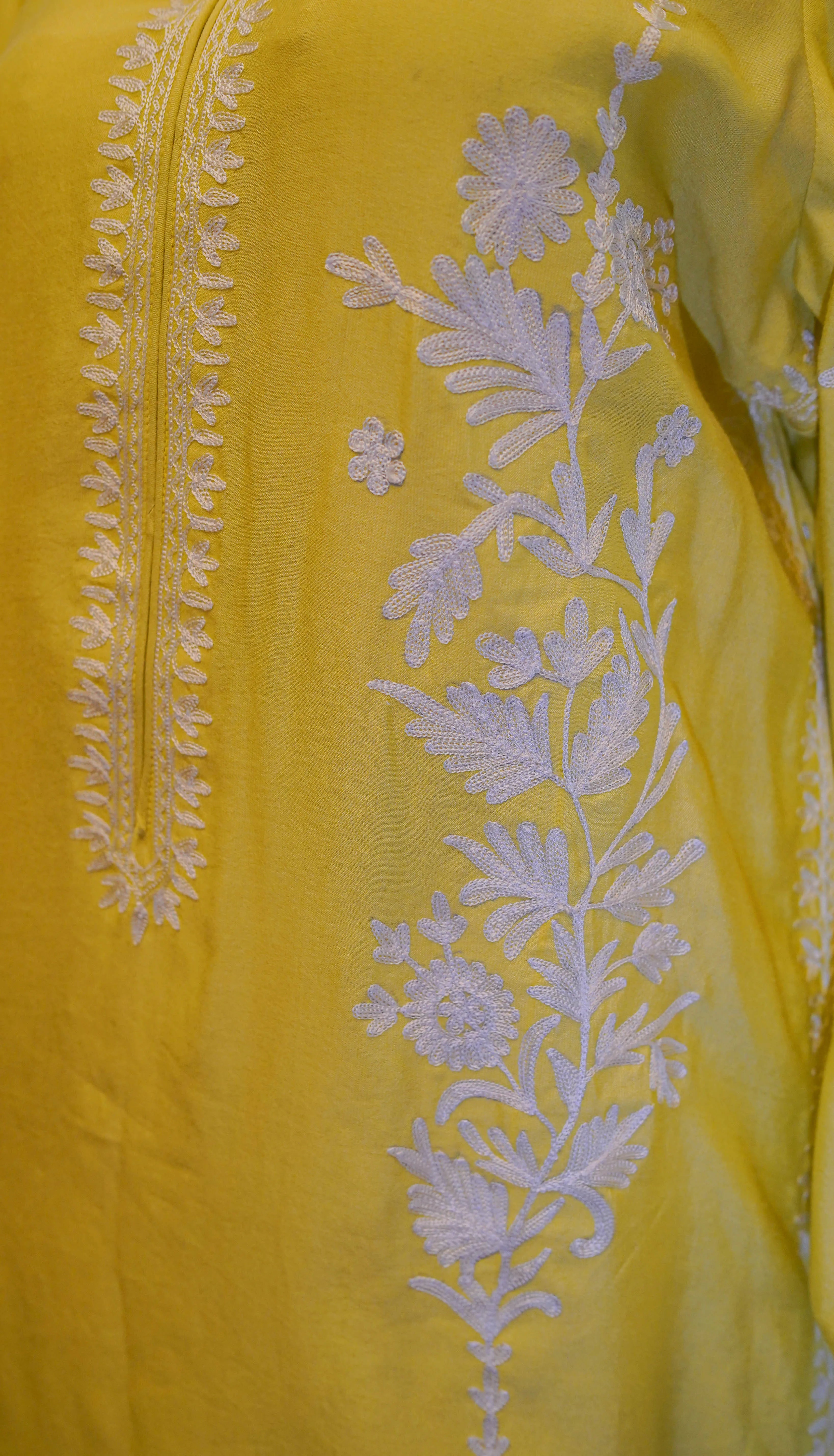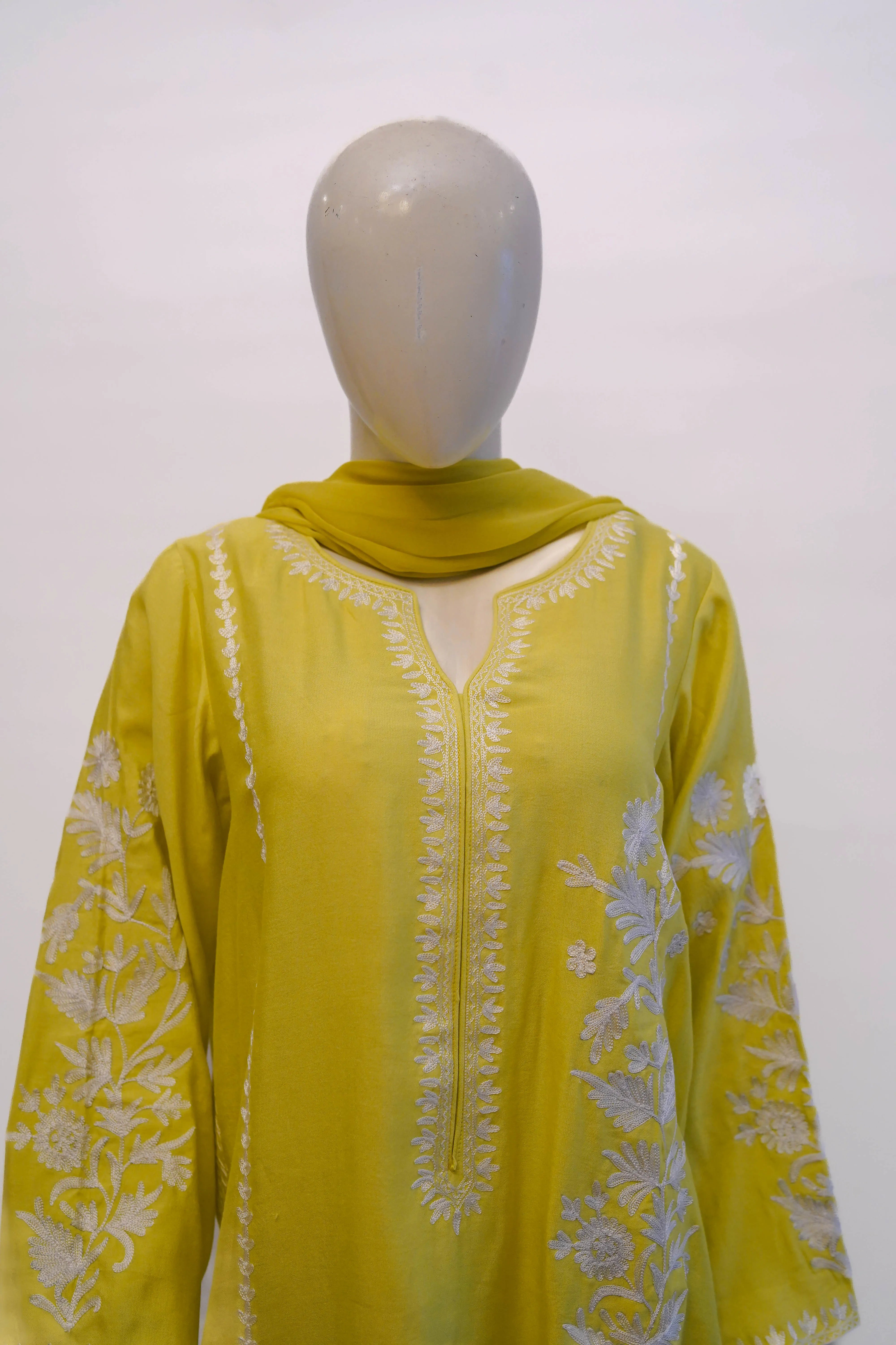 It’s made from premium cotton net fabric. This lemon yellow embroidered suit is stitched and ready-to-wear, so it saves you the hassle of tailoring. The set includes