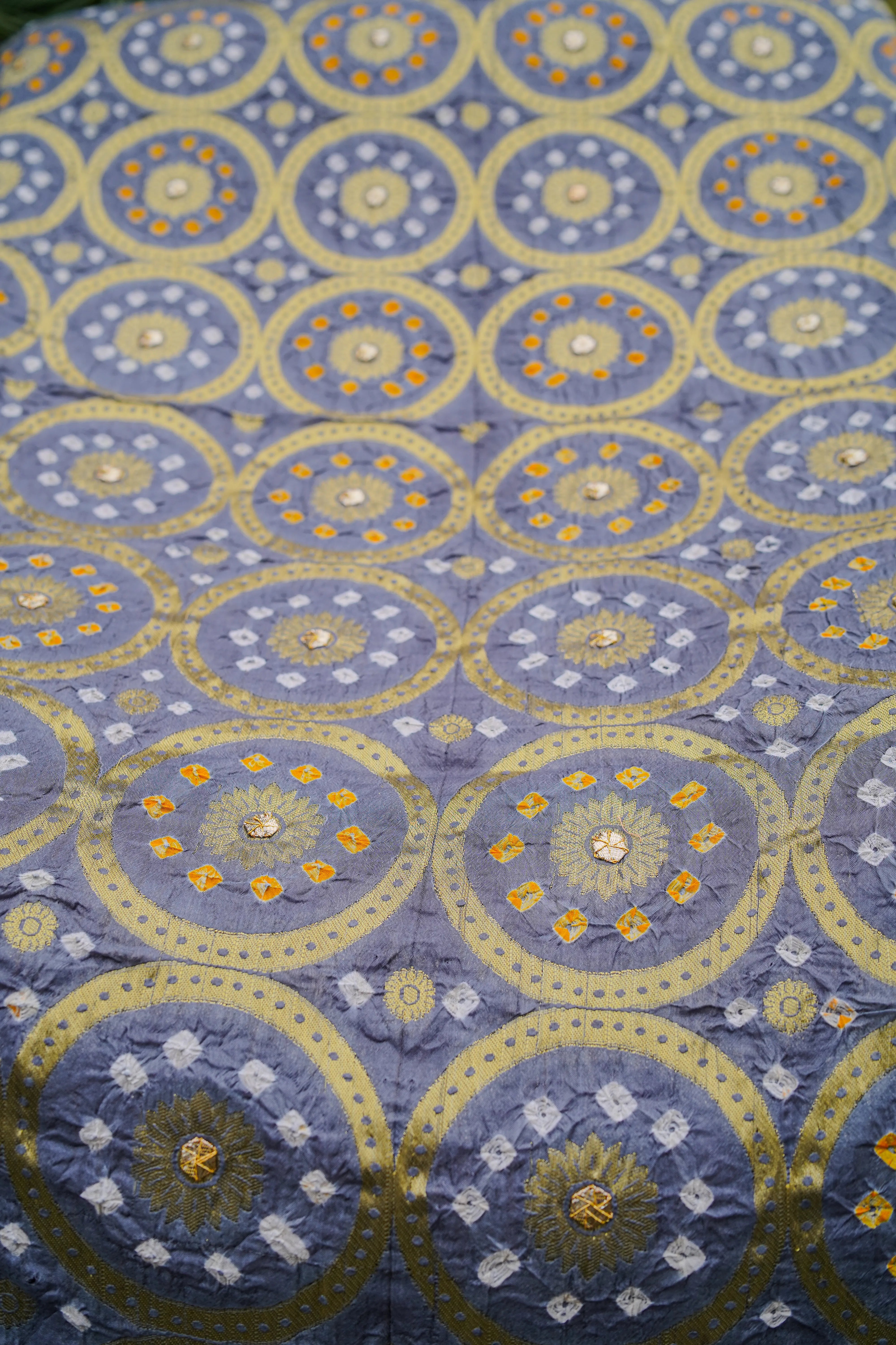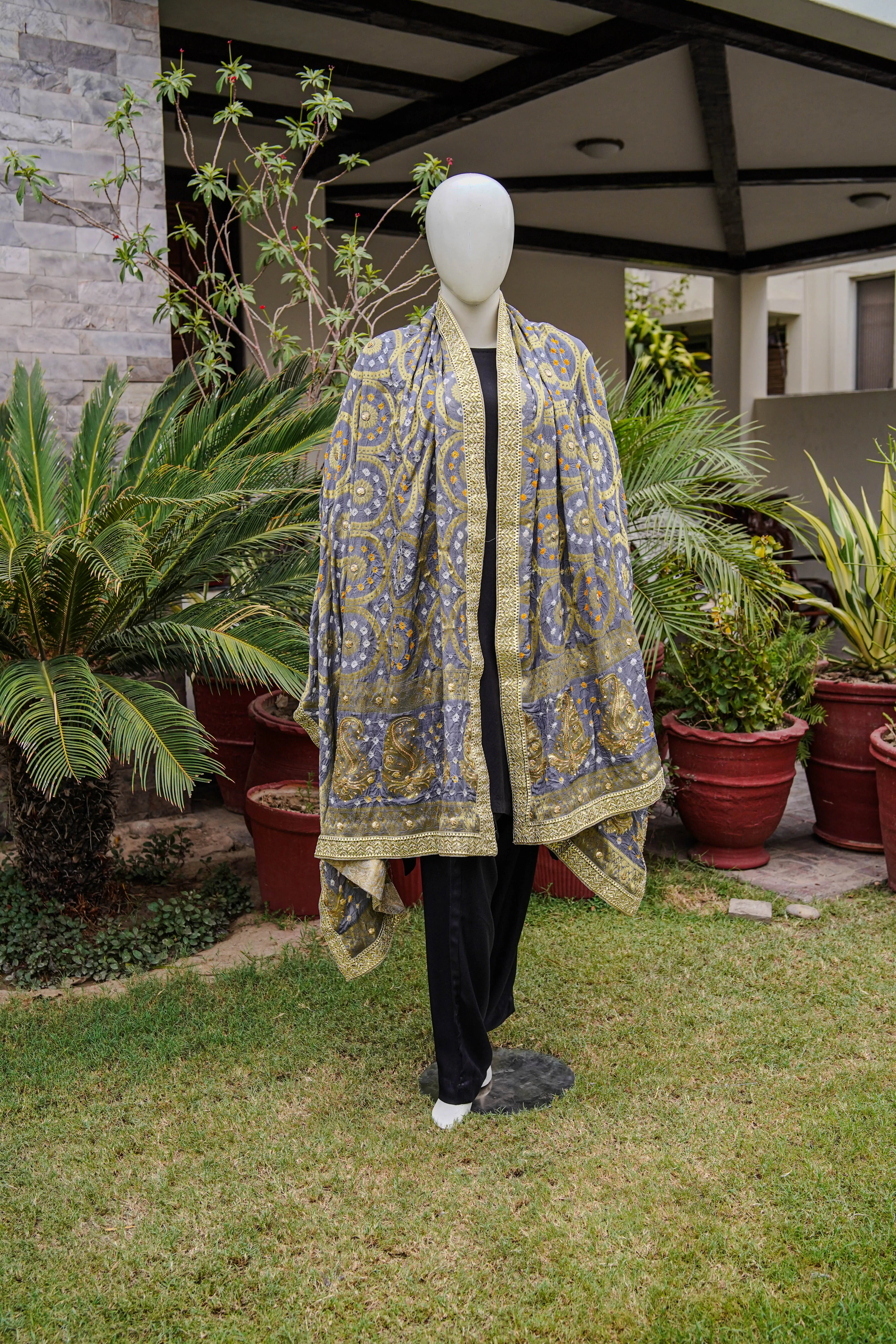 Grey chunri silk shawl with beautiful gota and detailed handwork. Edged with golden shimmery border, the shawl has a stunning drape.