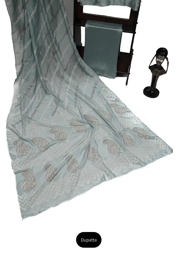 Ice blue is the perfect color for this summer. The cooling effect of this beautiful and soft colour would be a breath of fresh air. This ice blue silk suit is made to make you feel graceful on every occasion.