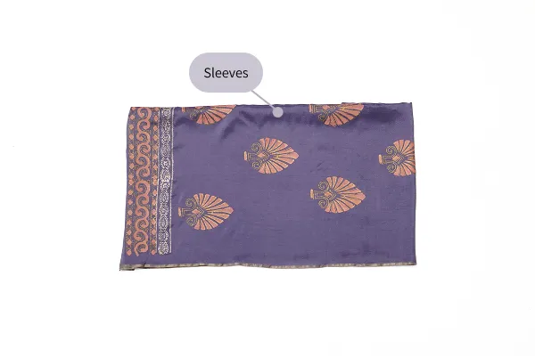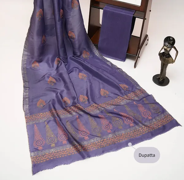 This Lavender block printed tussel silk three-piece suit is just the right pick. With its dreamy lavender shade and delicate block printing in pink, gold, and silver, it combines sophistication with comfort. This makes it a must-have for your wardrobe.