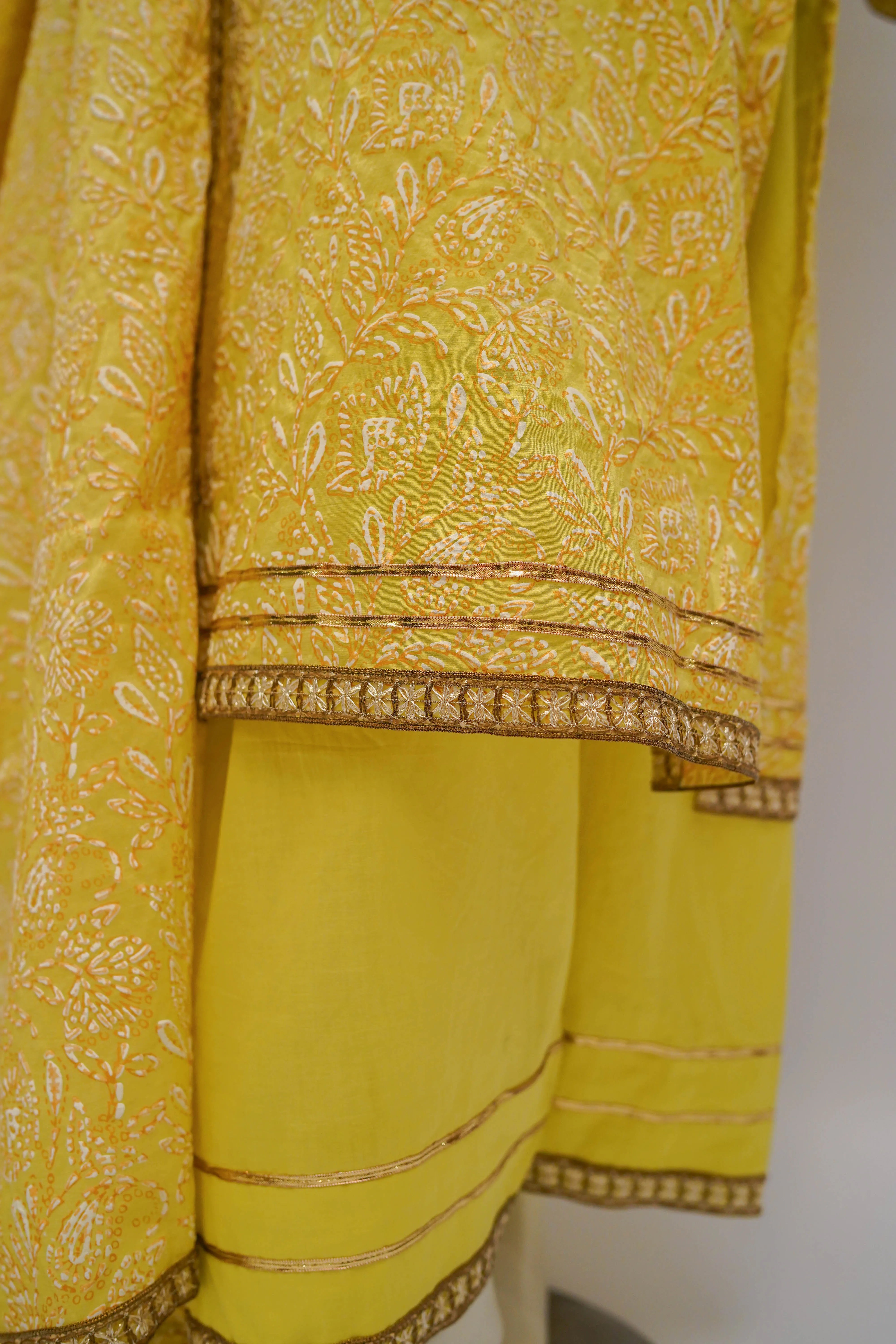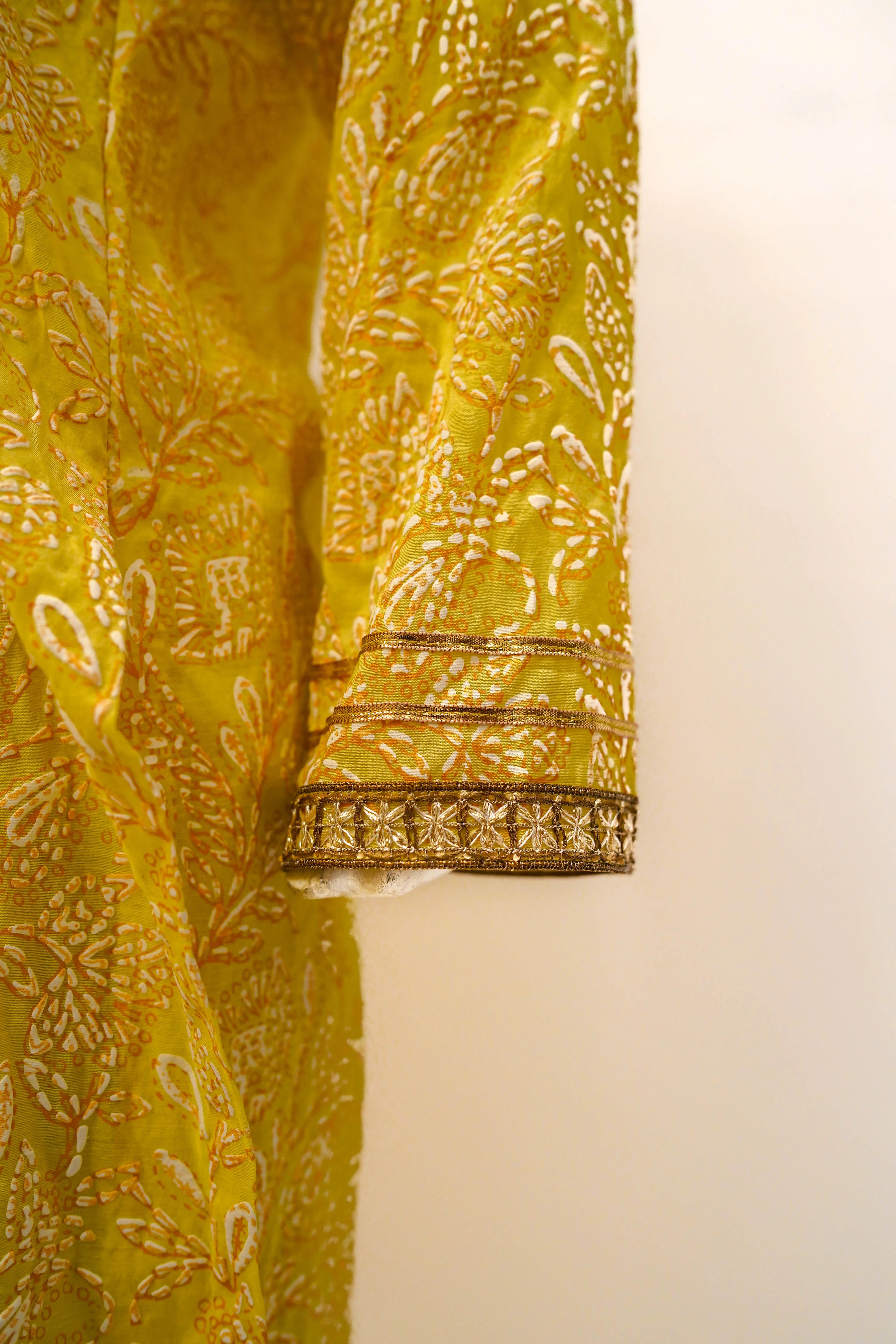 Lime-yellow silk lawn screen printed three-piece suit: