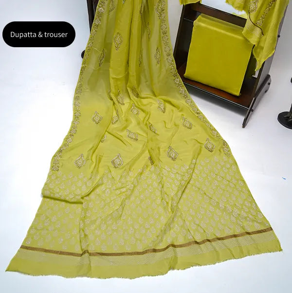 The shirt and trouser are pure cotton net. The dupatta is made of premium silk for an elegant finish.