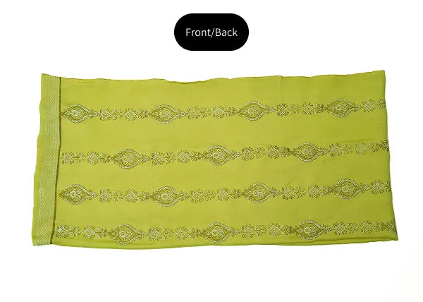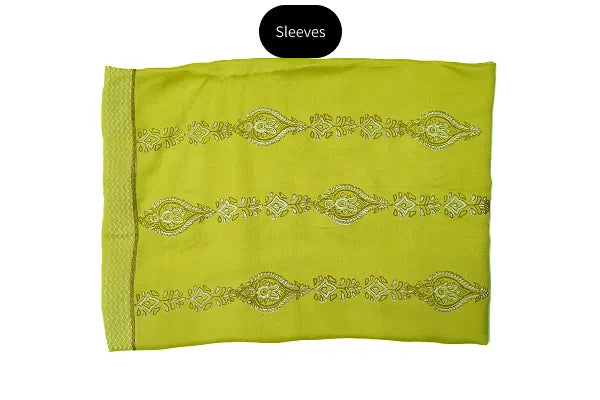 The shirt and trousers are made from breathable pure cotton net. It gives you that light and airy feel. To complete the set, the premium silk dupatta flows gracefully. It has delicate white and antique gold block prints. They bring a lovely touch of sophistication. So if you stitch it as a classic lime yellow cotton net kameez suit or experiment with modern cuts, it will look stunning either way.