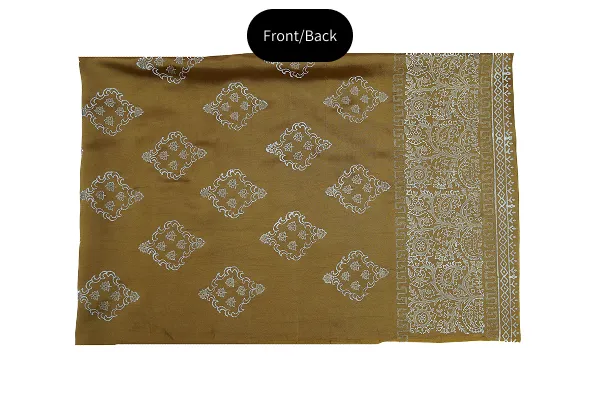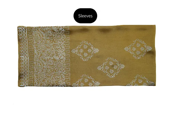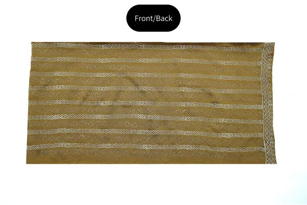 So, ladies, if you’re dressing up for a wedding or hosting a special dinner, this mustard brown block printed three piece tissue silk suit ensures you look effortlessly graceful while staying comfortable.