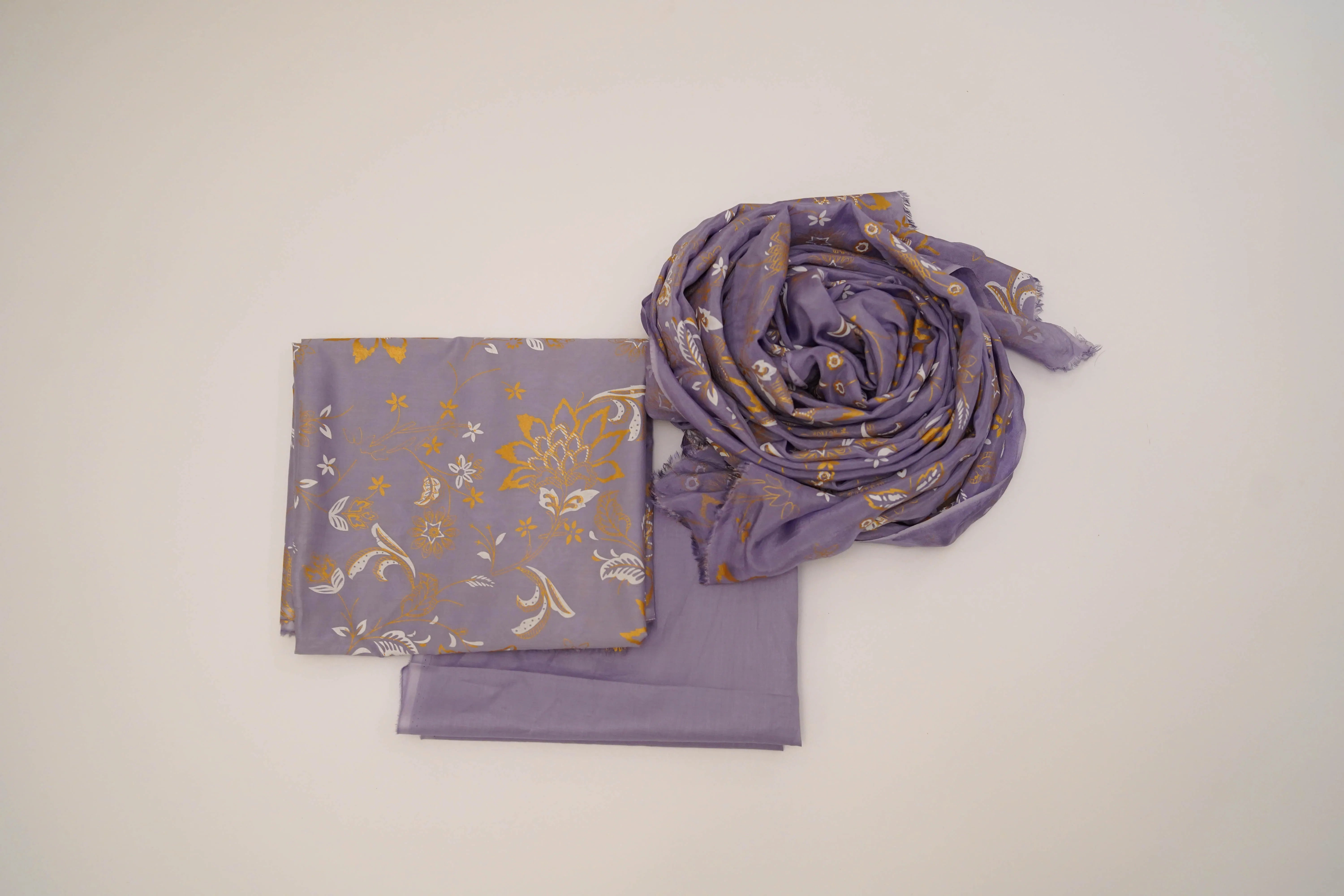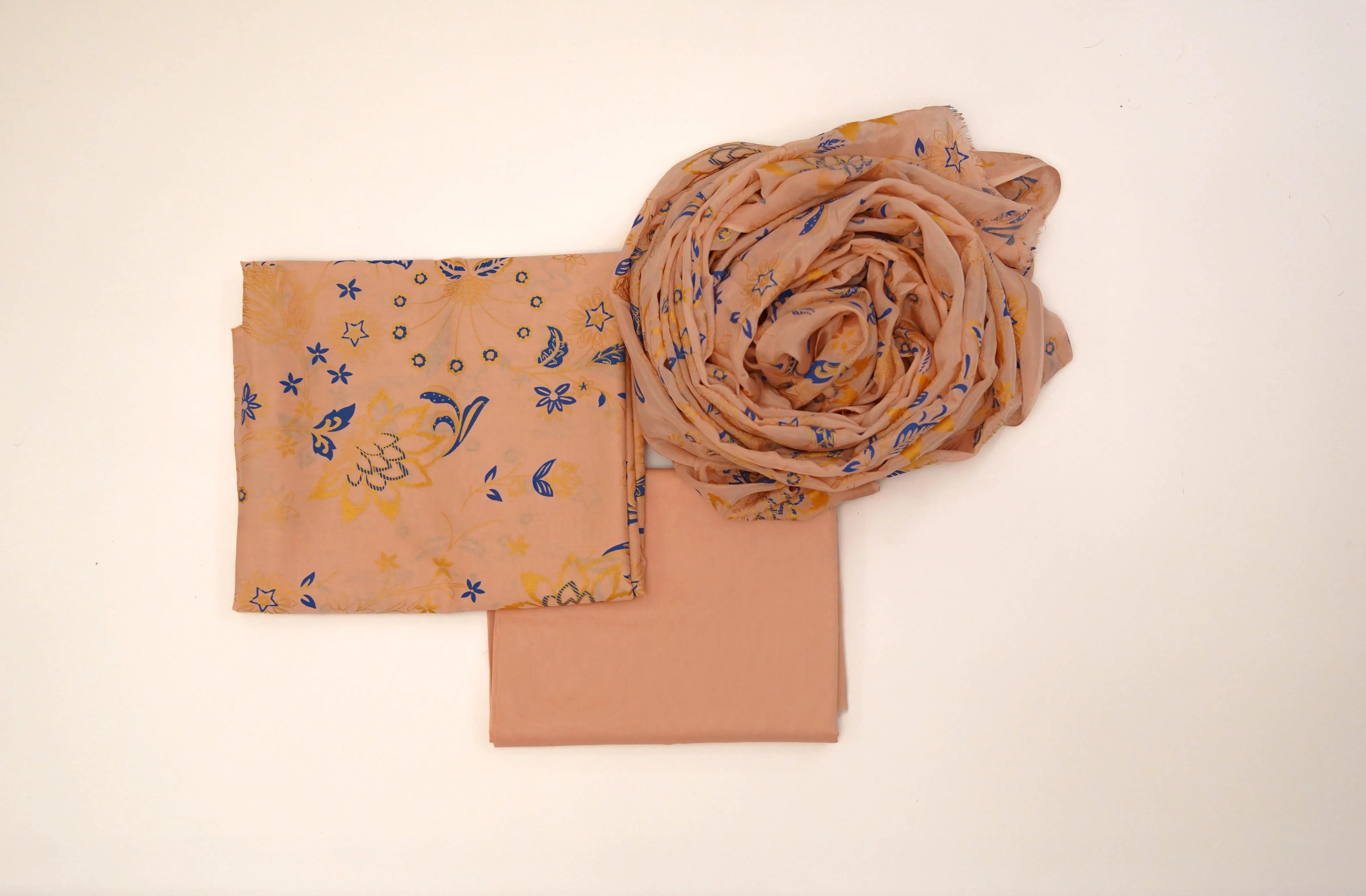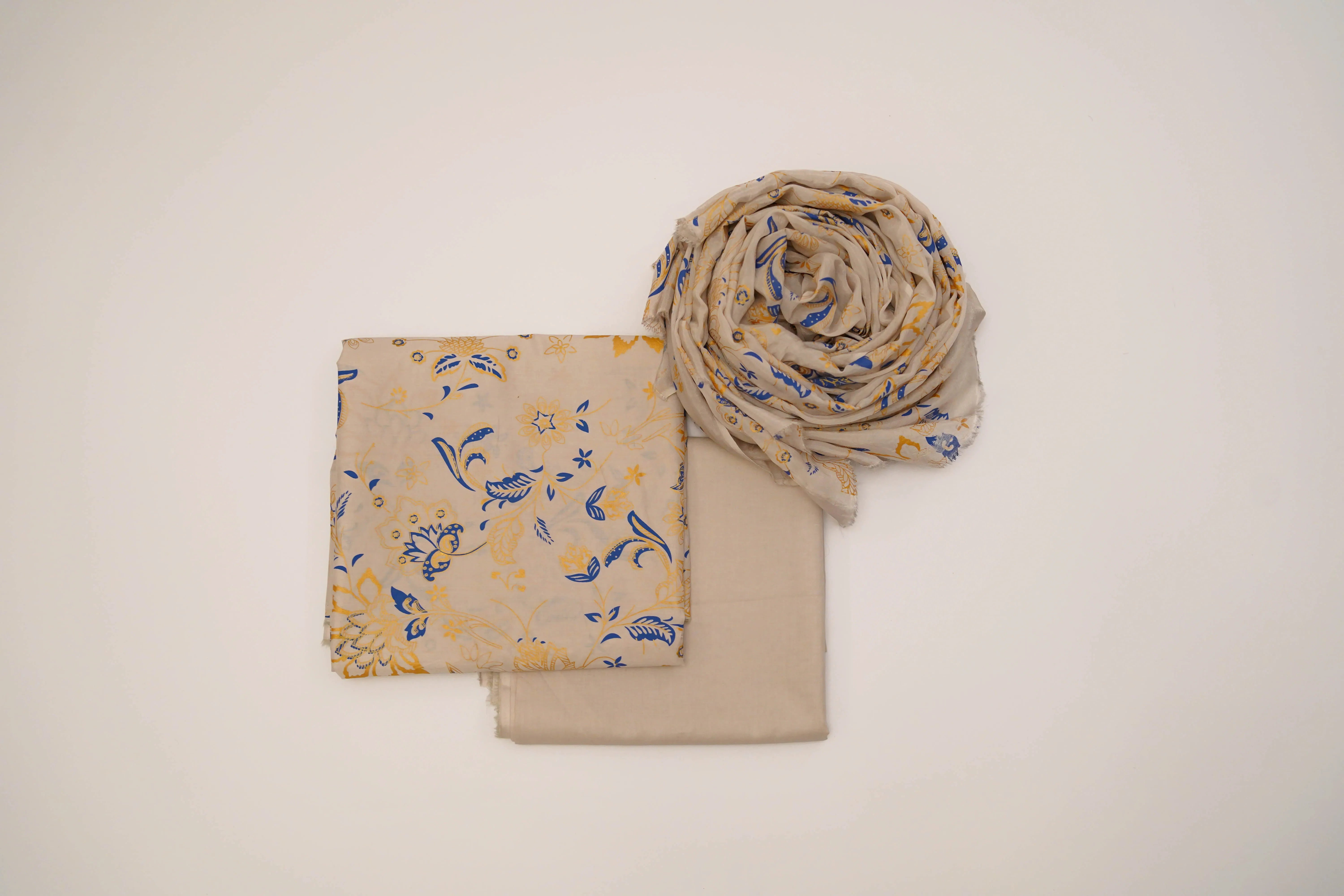 Three-piece suit, made from premium quality pure lawn. It features yellow, blue and gold screen printing on the shirt and dupatta. This three-piece suit includes a screen-printed shirt, a matching premium quality silk dupatta and a shalwar.