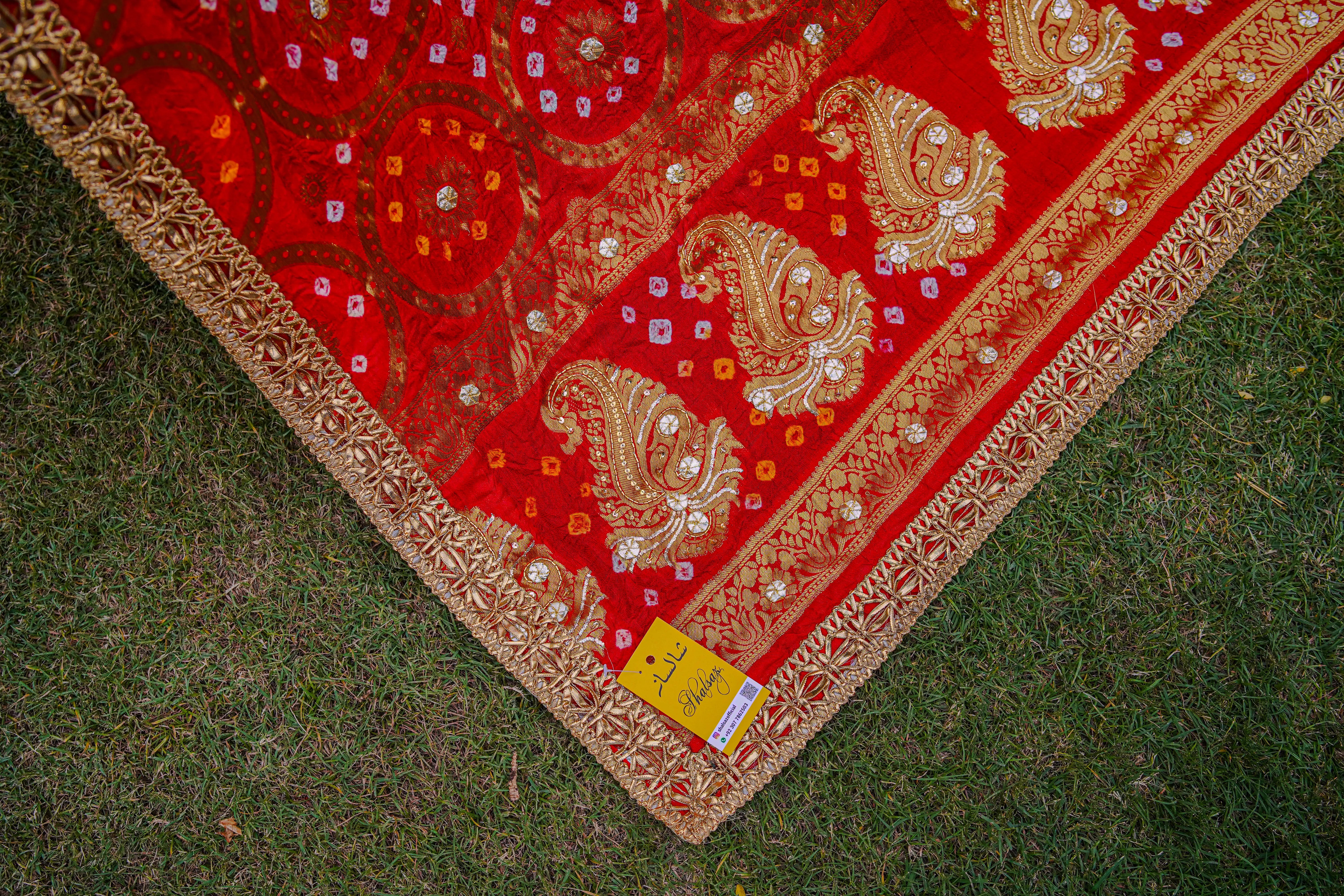 Some pieces just steal the show. This red chunri silk shawl is one of them. The rich red color with the classic chunri print makes it festive and perfect for wedding season. What really makes it stand out is the detailed handwork and beautiful gota. Every stitch adds beauty, giving it that special handcrafted feel.