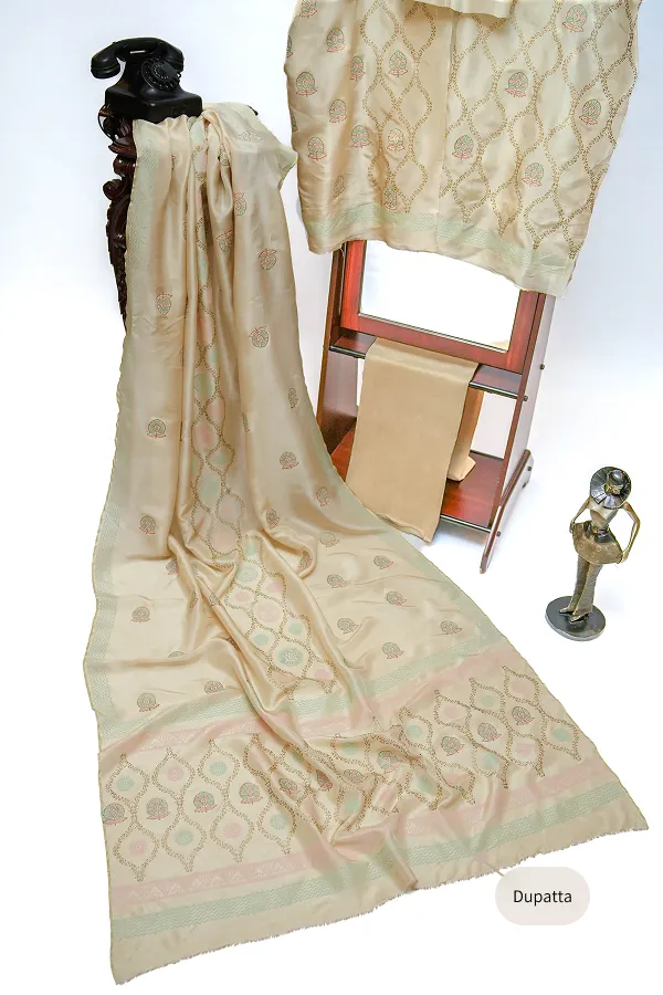 This neutral silk suit is in accordance with the latest trends and fashion. Since it’s an unstitched skin silk suit set with a dupatta, you have the freedom to style it however you like.