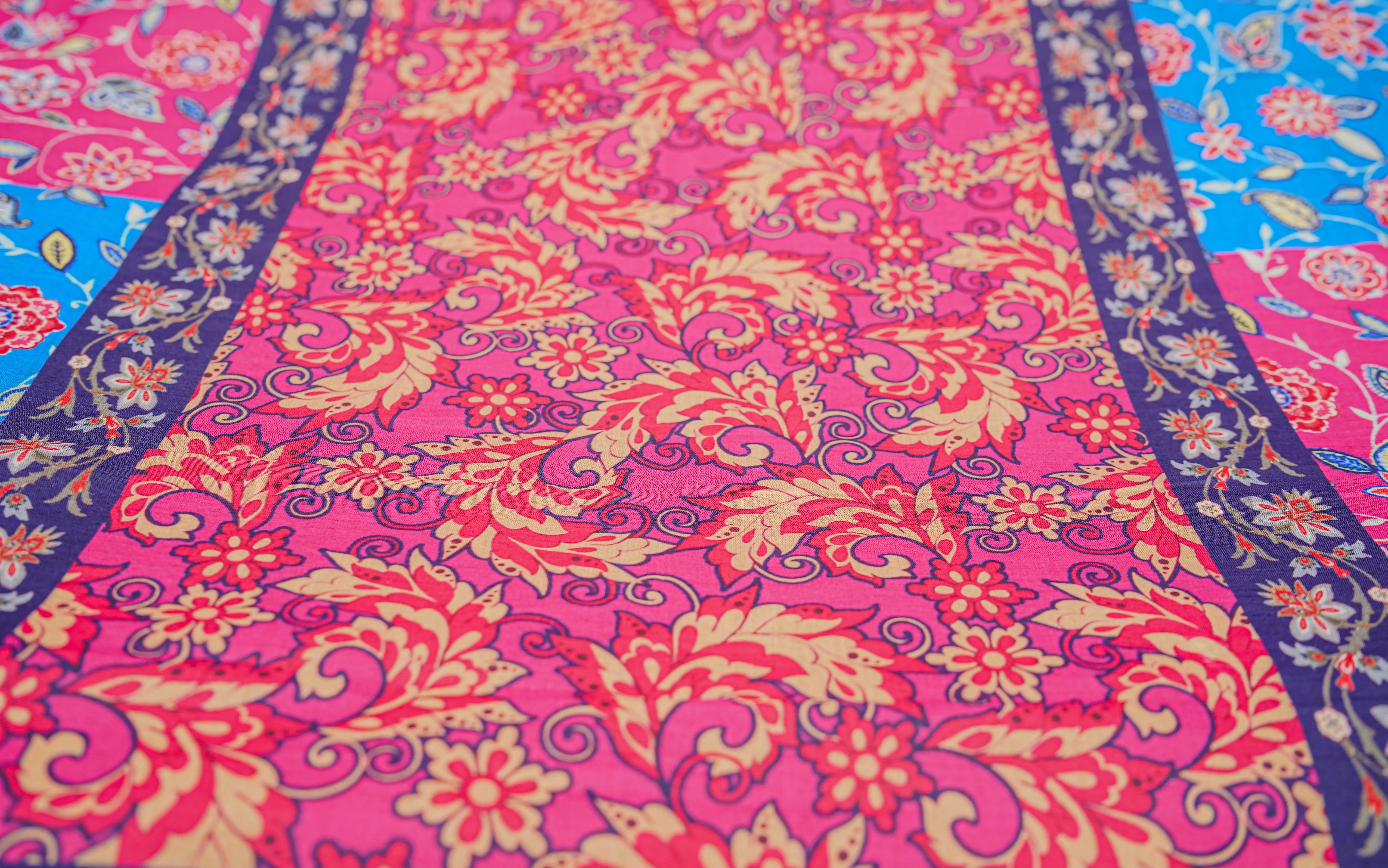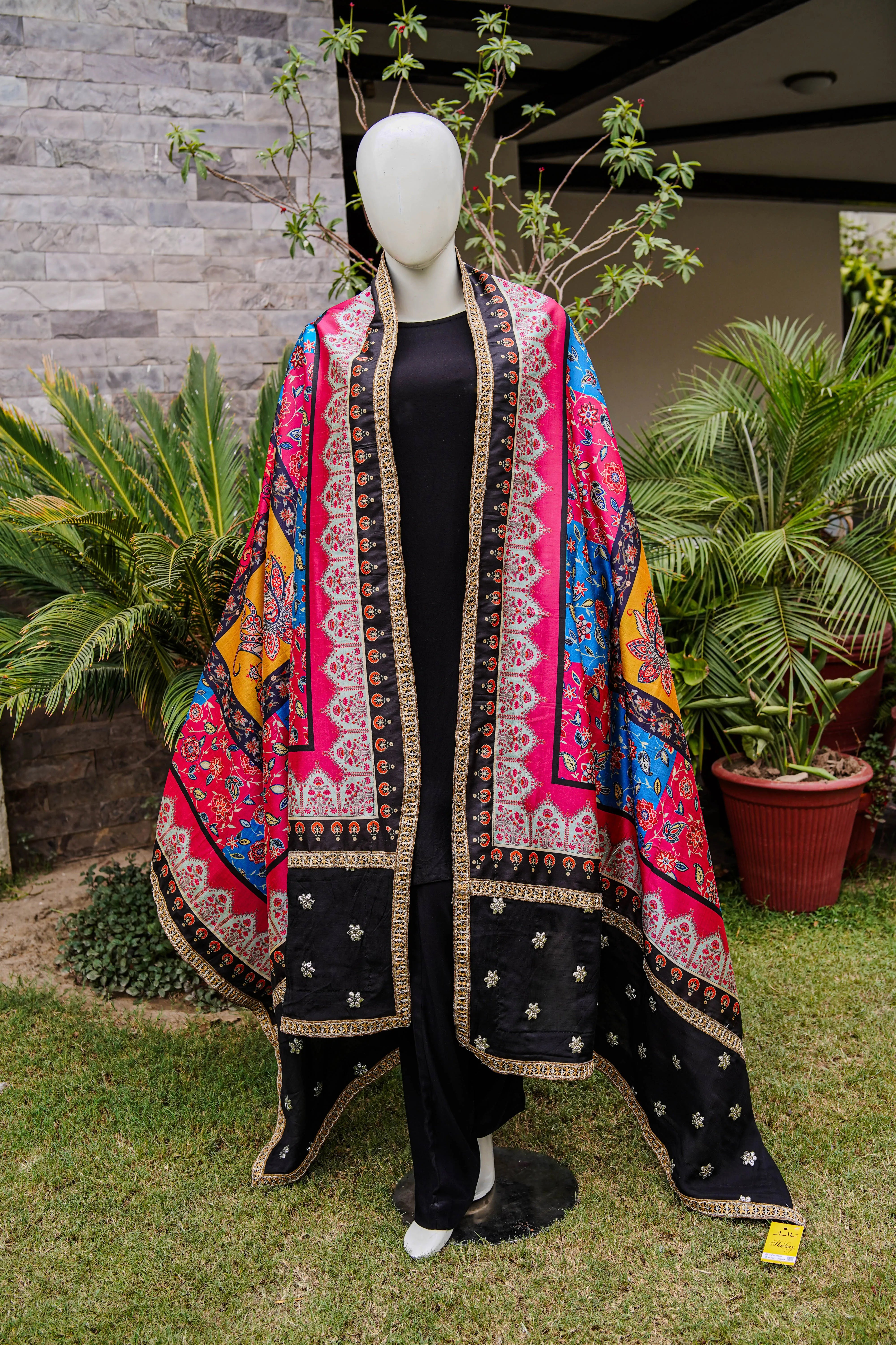A 3-yard silk shawl showcases a mosaic of colors, featuring intricate digital printing and elegant golden embellishments for a refined, timeless look.